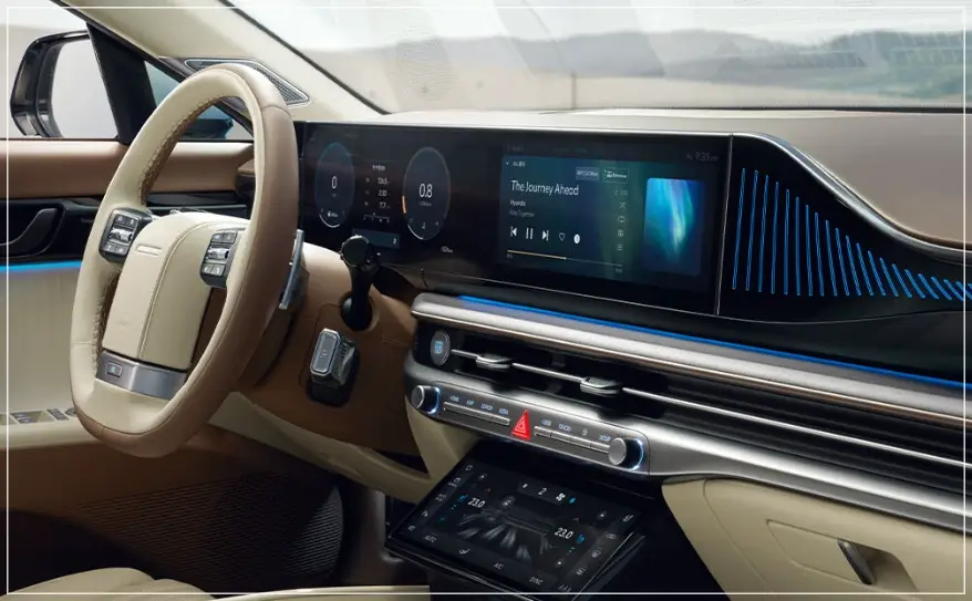 파노라믹 디스플레이로 클러스터와 내비게이션, 헤드업 디스플레이 간 일체감 있는 그래픽 테마를 구현했습니다. 자연어 기반의 음성인식과 미디어 스트리밍, 실시간 길 안내 등 다양한 콘텐츠를 제공합니다.